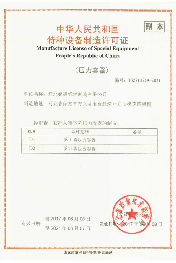 位于河北省保定市定興縣金臺經濟開發區槐茂路南側的河北智德鍋爐制造有限公司的資質范圍內的鍋爐制造及其相關的職業健康安全管理活動。